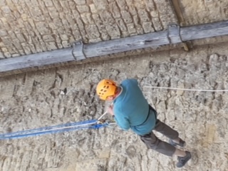 The climbing guys were very careful getting him over the parapet at the top of the tower, and made sure he was secure before they started belaying him down. He got huge applause…the whole village turns out for the festival events, and we had 6 of the family there to cheer as well. He raised over £1,600 in sponsorship which absolutely amazed us.
